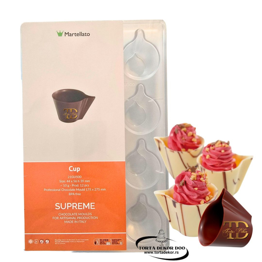 Profesionalni kalupi izrađeni od polikarbonata, materijala koji Vam omogućava da dobijete savršene čokoladne čašice u orginalnim oblicima. Važno je dobro temperirati čokoladu pre nego se ulije u kalup.