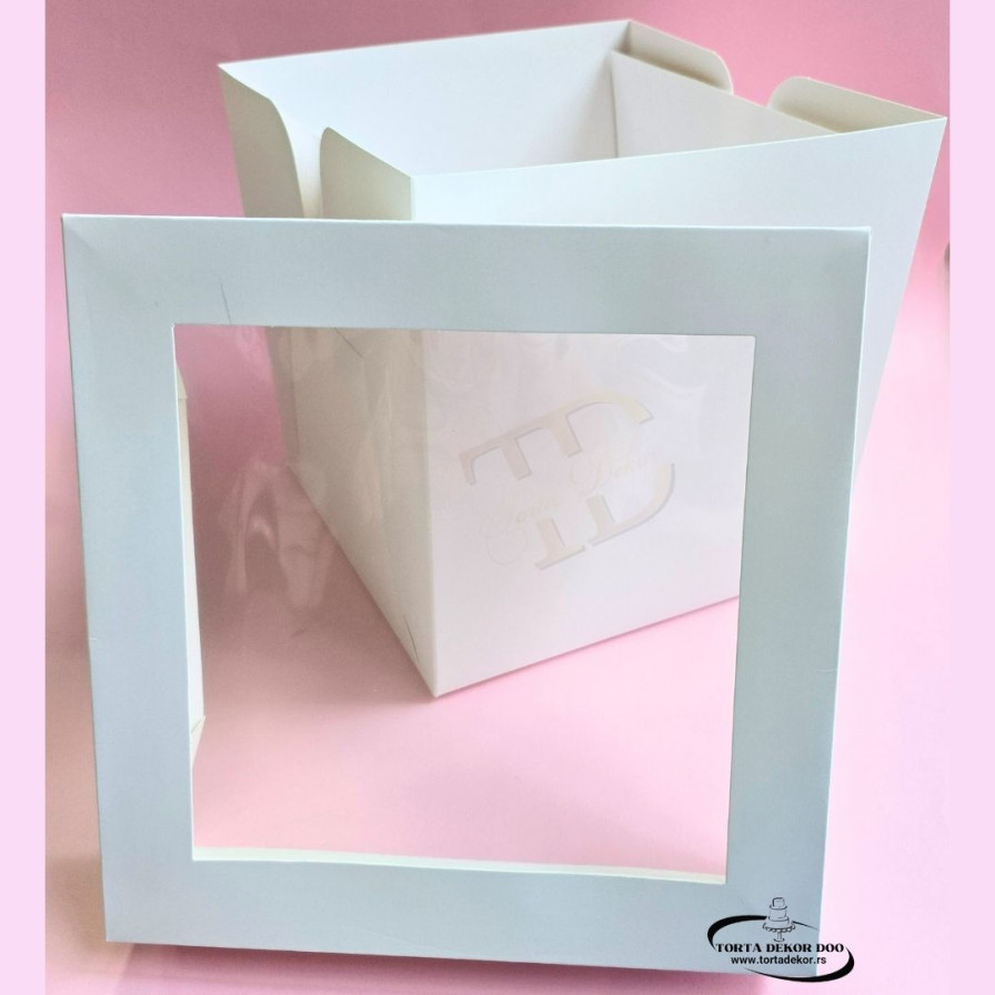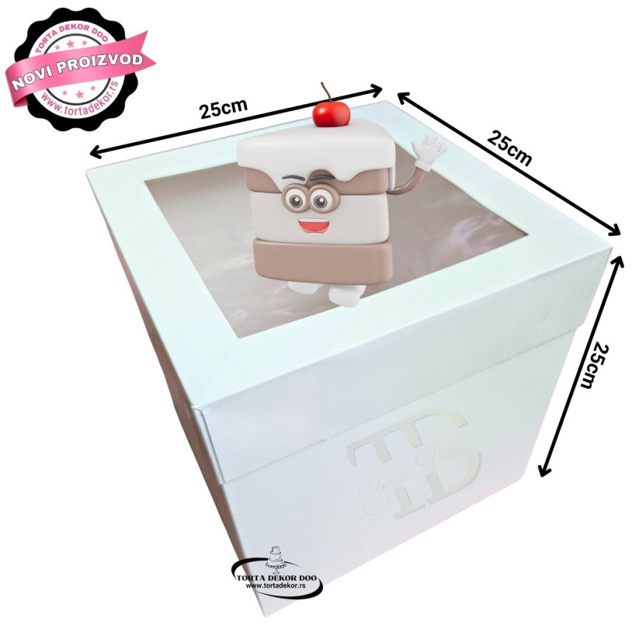 Kutija za tortu sa prozorom dimenzija 25x25x25 cm izrađena je od kartona odobrenog za kontakt sa hranom.