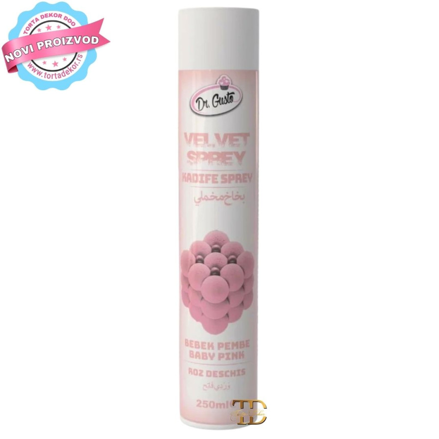 Dr. Gusto velvet sprej – bebi pink 250ml je profesionalni baršunasti (velvet) sprej koji stvara prepoznatljiv somot/velvet efekat na hladnim desertima. Zahvaljujući visokom sadržaju kakao putera, sprej daje tortama i kolačima mat, mekan i luksuzan završni izgled.