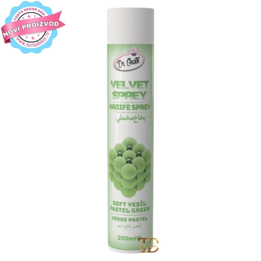 Dr. Gusto velvet sprej – nežno zeleni 250ml je profesionalni baršunasti (velvet) sprej namenjen za dekoraciju i bojenje površina torti i deserata. Ovaj sprej stvara prepoznatljiv baršunasti efekat na hladnim proizvodima, dodajući im luksuzan, moderan i savršeno ujednačen vizuelni izgled.