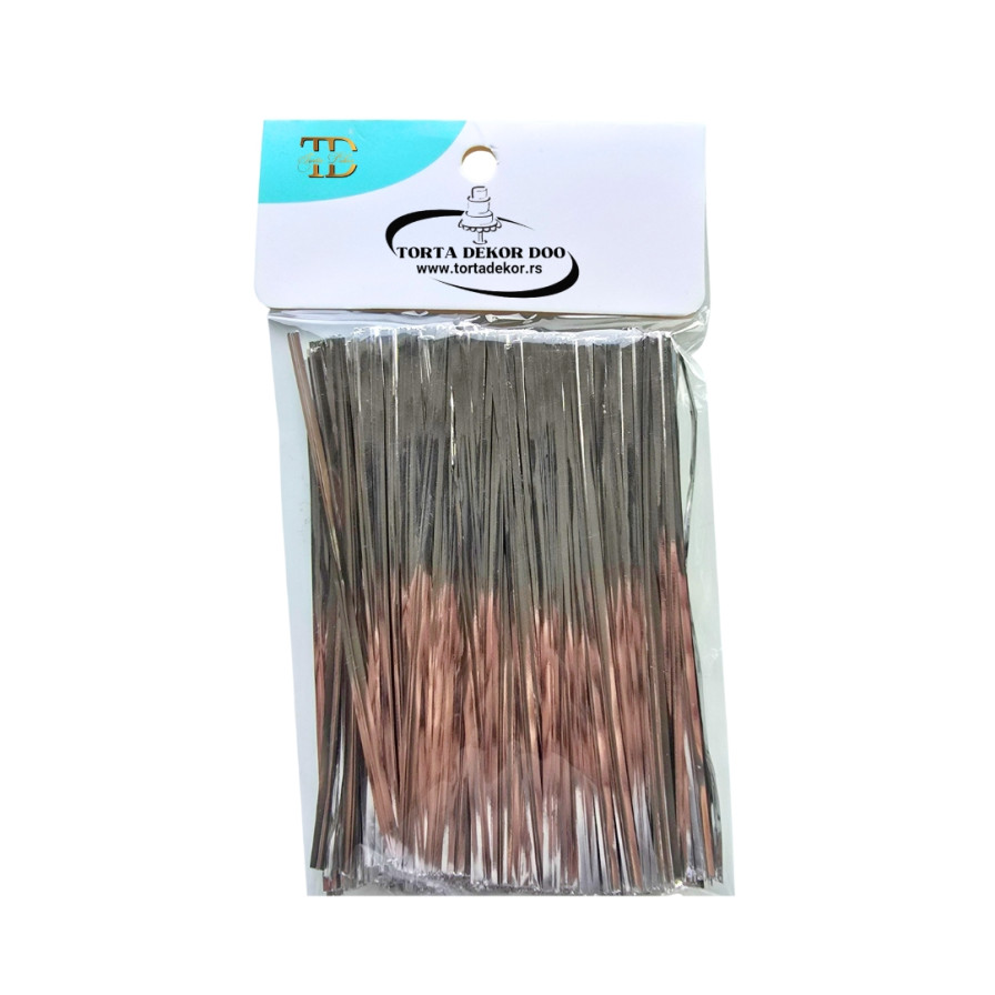 Zatvarači za celofan kese sa metalnim jezgrom, presvučeni plastikom u Srebrnoj boji. Idealne su za lako pakovanje i brzo zatvaranje kesa. Metalna žica koja se nalazi unutra je odličnog kvaliteta i garantuje ponovnu upotrebu vezice.
