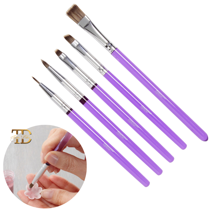 U setu od 5 četkica su okrugla za debele i četkica za tanke linije, mala ravna četkica za senčenje i mešanje, ravna četkica pod uglom za zakrivljene poteze i široka ravna četkica za bojenje velikih površina.