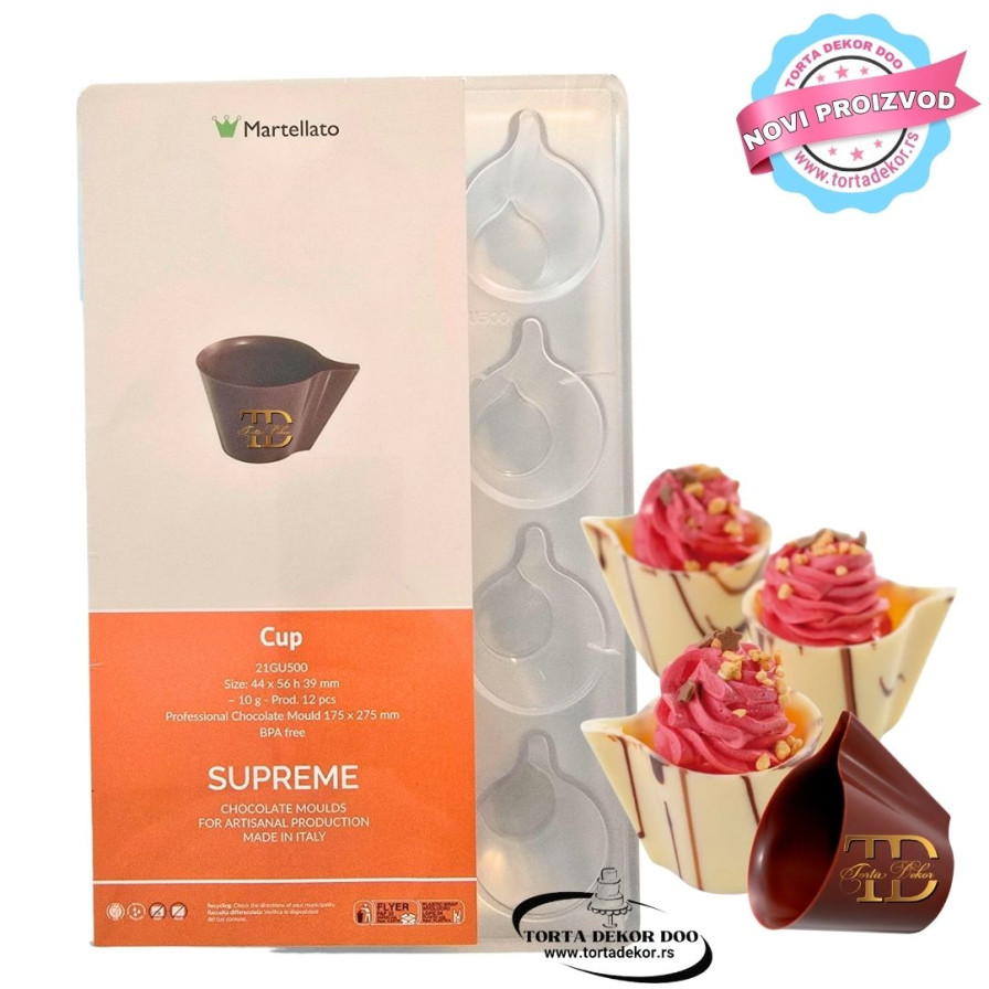 Profesionalni kalupi izrađeni od polikarbonata, materijala koji Vam omogućava da dobijete savršene čokoladne čašice u orginalnim oblicima. Važno je dobro temperirati čokoladu pre nego se ulije u kalup.