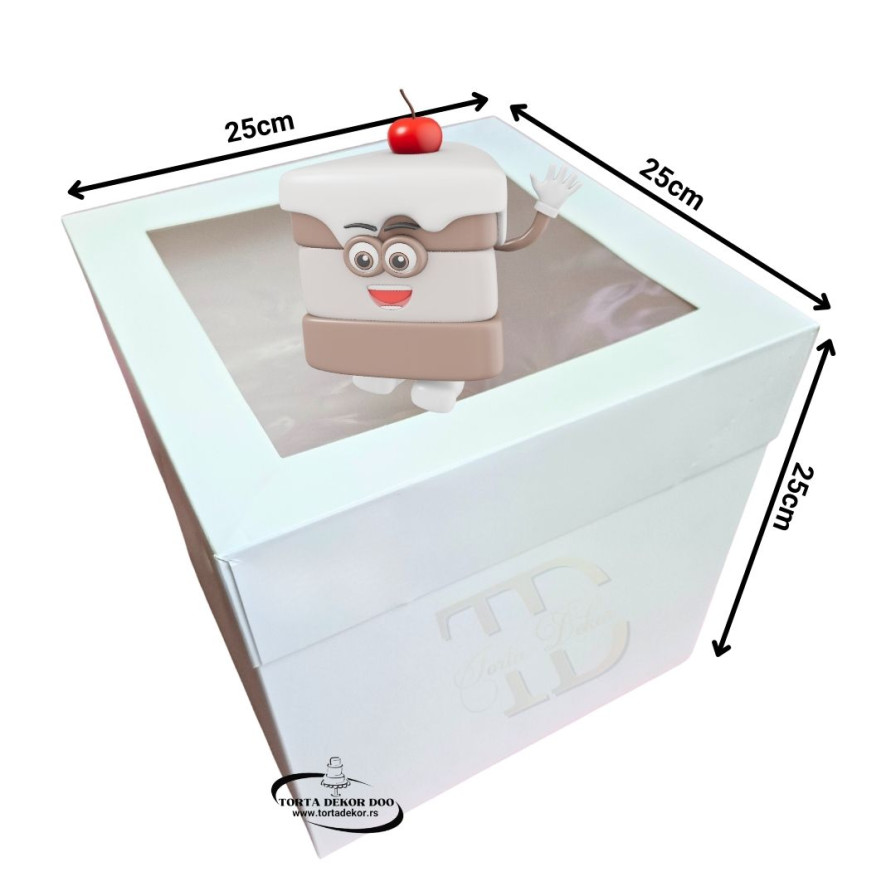 Kutija za tortu sa prozorom dimenzija 25x25x25 cm izrađena je od kartona odobrenog za kontakt sa hranom.