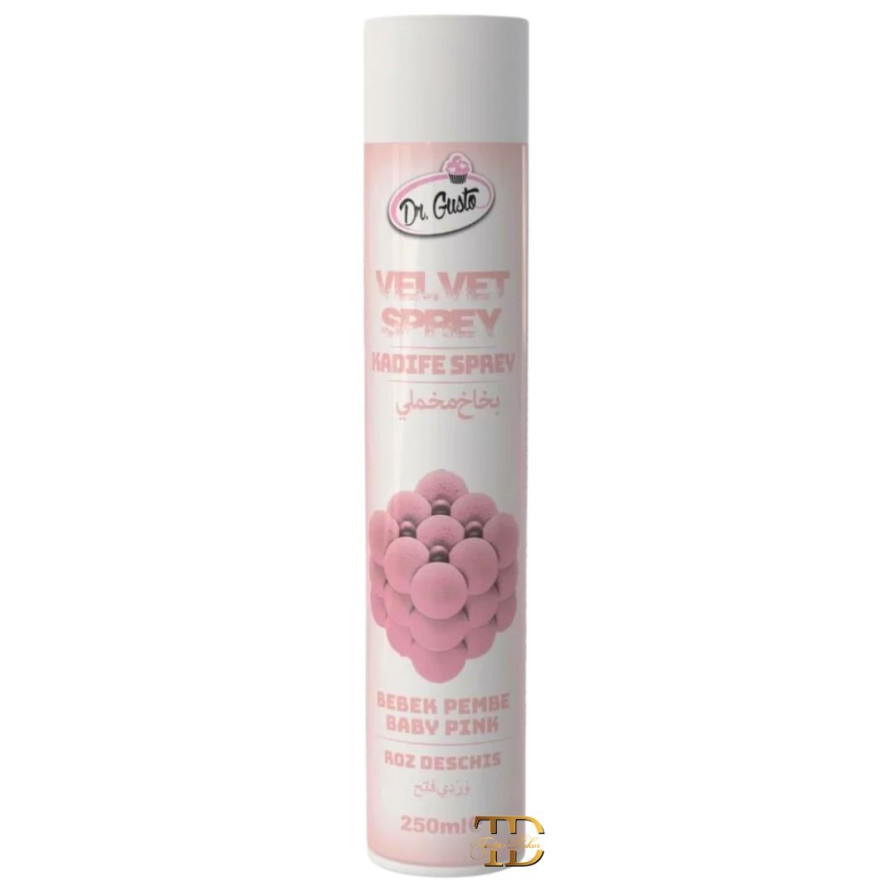 Dr. Gusto velvet sprej – bebi pink 250ml je profesionalni baršunasti (velvet) sprej koji stvara prepoznatljiv somot/velvet efekat na hladnim desertima. Zahvaljujući visokom sadržaju kakao putera, sprej daje tortama i kolačima mat, mekan i luksuzan završni izgled.