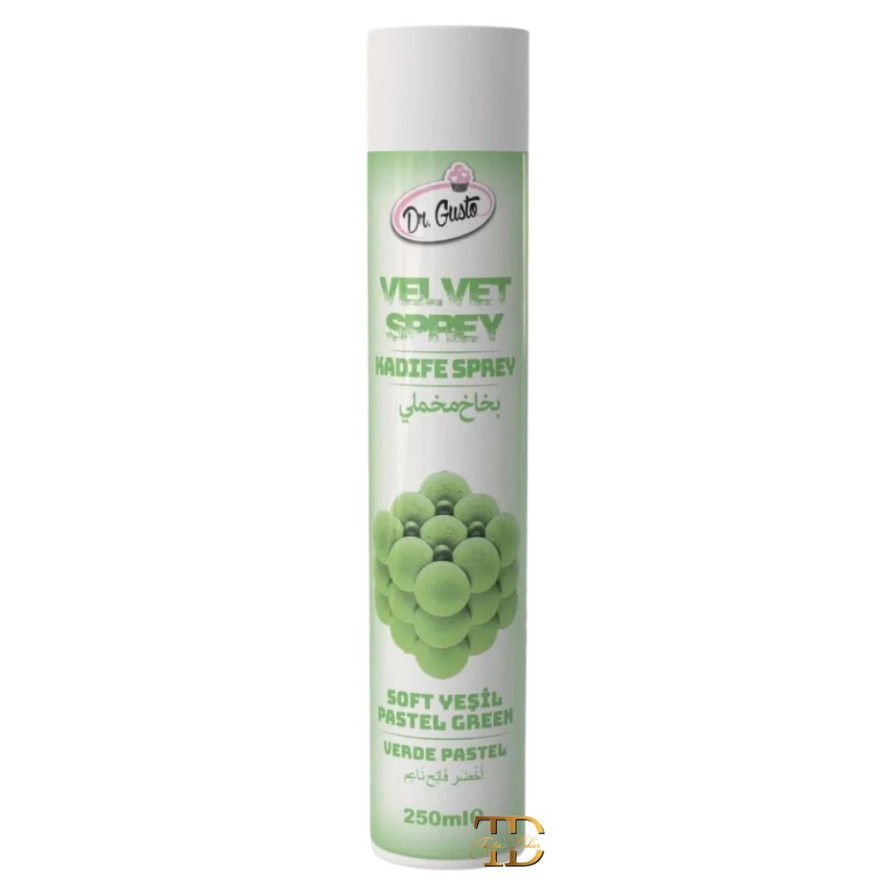 Dr. Gusto velvet sprej – nežno zeleni 250ml je profesionalni baršunasti (velvet) sprej namenjen za dekoraciju i bojenje površina torti i deserata. Ovaj sprej stvara prepoznatljiv baršunasti efekat na hladnim proizvodima, dodajući im luksuzan, moderan i savršeno ujednačen vizuelni izgled.