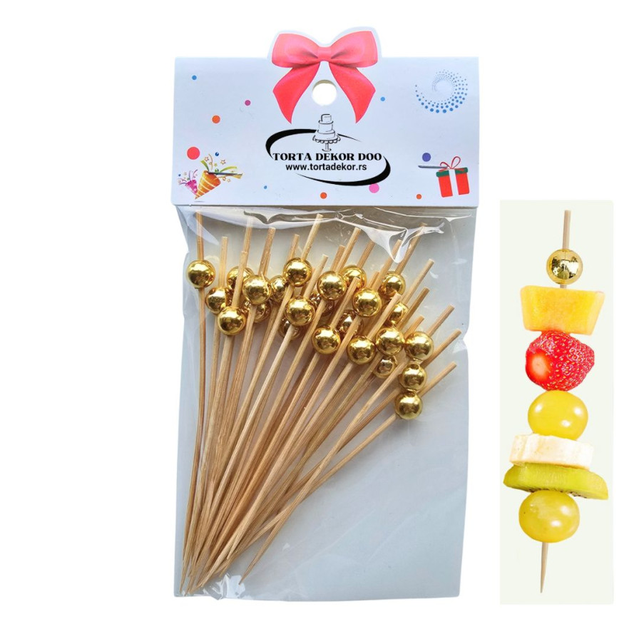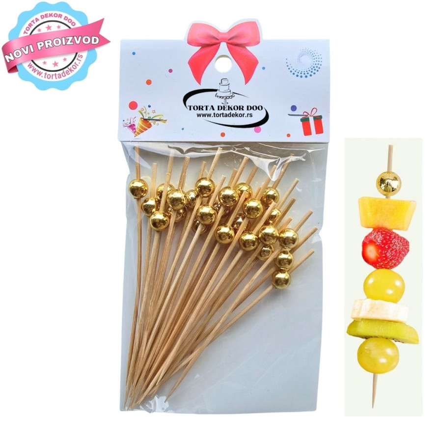 Ovaj set sadrži 24 koktel čačkalica dužine 12 cm, savršen za vašu svakodnevnu upotrebu. Napravljen od visokokvalitetnog prirodnog bambusa, čačkalice su čvrste, sa glatkom površinom i zlatnom lopticom na vrhu, što olakšava korišćenje. Njihov elegantan dizajn dodaje stil vašim zalogajima, a idealne su za dekoraciju kanapea, sendviča, koktela, martini maslina, voćnih ražnjića... 🍡🍢🍹🍸. Ove čačkalice su savršene za svaku proslavu, i čine da vaši kokteli i predjela izgledaju profesionalno.