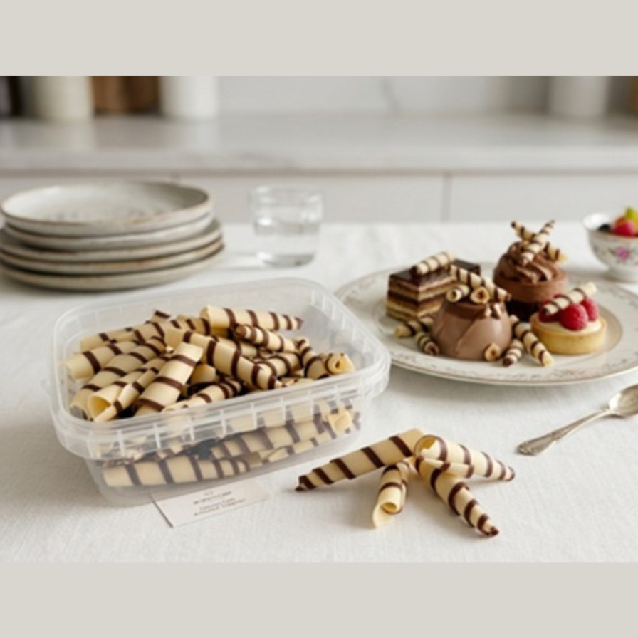 Mramorni Čokoladni Štapići klasika sa modernim preokretom. Elegantni štapići sa crno-belim mramornim šarama pružaju vizuelnu dinamiku i visinu vašim desertima. Napravljeni od kombinacije tamne i bele čokolade, savršeni su za dekoraciju ivica torti ili kao centralni detalj na kremastim kupovima.